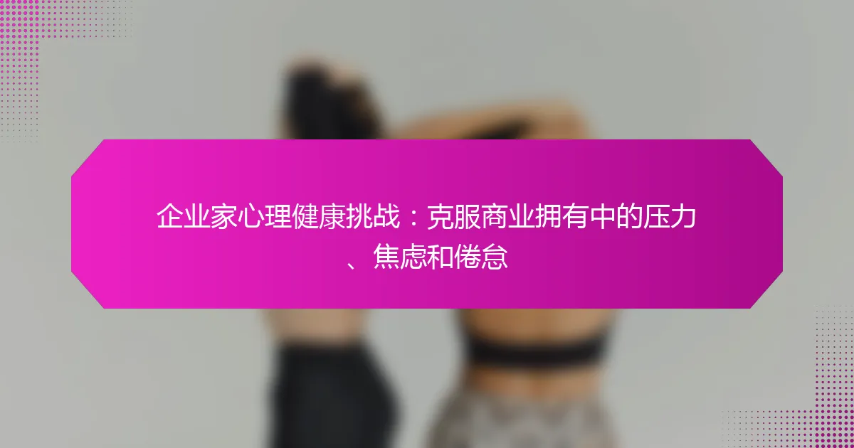 企业家常常面临心理健康挑战,包括压力、焦虑和孤独。这些问题源于企业所有权的高要求,例如财务不确定性和长时间工作。应对这些挑战需要实施积极的策略、寻求专业帮助以及建立支持网络。优先考虑心理健康对于增强韧性和实现可持续的商业成功至关重要。 企业家面临的常见心理健康挑战有哪些? 企业家常常面临心理健康挑战,如压力、焦虑和孤独。这些问题源于企业所有权的压力,包括财务不确定性和工作负荷要求。 压力通常源于长时间工作和需要做出关键决策。一项研究发现,72%的企业家报告经历过心理健康问题,突显了商业所有者中焦虑的普遍性。由于创业的高要求,孤独感可能会出现,导致缺乏社会支持。 应对这些挑战需要积极的策略。企业家可以通过寻求专业帮助、建立支持网络和实践自我关怀程序来受益。优先考虑心理健康可以增强韧性和整体商业表现。 压力如何影响商业表现? 压力通过降低生产力、损害决策能力和增加缺勤率来对商业表现产生负面影响。企业家常常面临独特的心理健康挑战,导致压力水平升高。高压力可能导致创造力和创新能力下降,而这些对于商业增长至关重要。此外,持续的压力可能导致倦怠,进一步降低表现并危及商业可持续性。通过有效的应对策略来应对压力对于维持最佳商业运营和心理健康至关重要。 焦虑在决策中扮演什么角色? 焦虑显著损害决策能力,使判断变得模糊并增加优柔寡断。由于压力和孤独,企业家常常面临更高的焦虑,这可能导致糟糕的选择。慢性焦虑可能导致风险规避,限制创新和增长的机会。管理焦虑的有效策略包括正念和结构化决策过程,这可以增强商业决策的清晰度和信心。 孤独如何影响企业家的幸福感? 孤独通过增加压力和焦虑水平对企业家的幸福感产生负面影响。企业家常常面临孤独,这可能导致动力和生产力下降。研究表明,72%的企业家经历心理健康挑战,主要源于孤独。建立支持网络可以缓解这些感受并增强整体幸福感。 创业中心理健康挑战的普遍属性是什么? 企业家面临普遍的心理健康挑战,包括压力、焦虑和孤独。这些挑战源于企业所有权的高要求,创造了情感负担的独特属性。压力通常源于财务压力和决策责任。市场条件和个人表现的不确定性可能加剧焦虑。孤独是一个罕见的属性,因为企业家经常独自工作,缺乏支持系统。应对这些挑战对于可持续的商业成功至关重要。 商业所有者倦怠的迹象有哪些? 商业所有者的倦怠表现为身体和情感的疲惫、表现下降和脱离感。主要迹象包括慢性疲劳、易怒、缺乏动力和注意力集中困难。这些症状可能导致严重的心理健康挑战,影响整体商业成功。及早应对倦怠对于维护企业家的幸福感和生产力至关重要。
